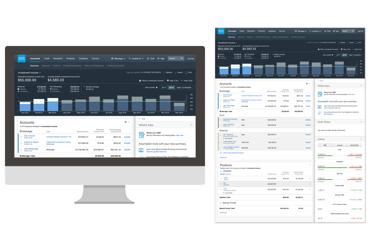 Charles Schwab offers brokerage, banking, and financial advisory services to customers. As a Senior UX Designer at Schwab, I worked on features used by brokerage clients to view and manage their accounts. My role encompassed everything from initial requirements gathering, journey mapping, UX design, prototyping, and assisting with user research sessions, to working with content writers and assisting development teams with any design issues encountered during production. I worked closely with teams spread across the country, as well as engaged with outside venders.